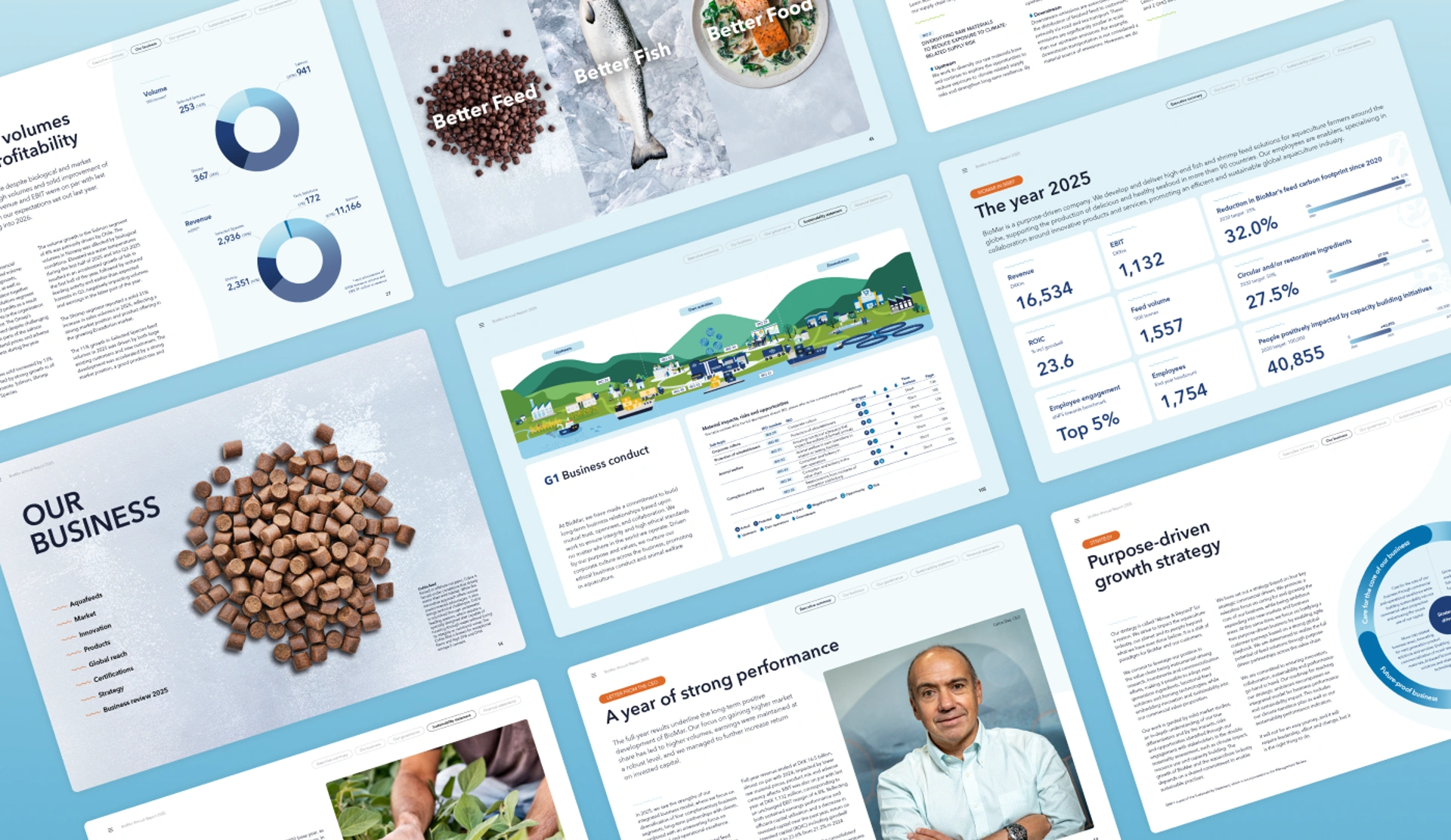 The BioMar 2025 annual report builds on the design direction established in the 2024 report and evolving it into a fully integrated report both structurally and visually. For the first time, BioMar presents its financial performance and sustainability ambitions as a unified narrative, brought together through consistent visual touchpoints, intuitive tags, and recurring infographics that create clarity and continuity throughout.