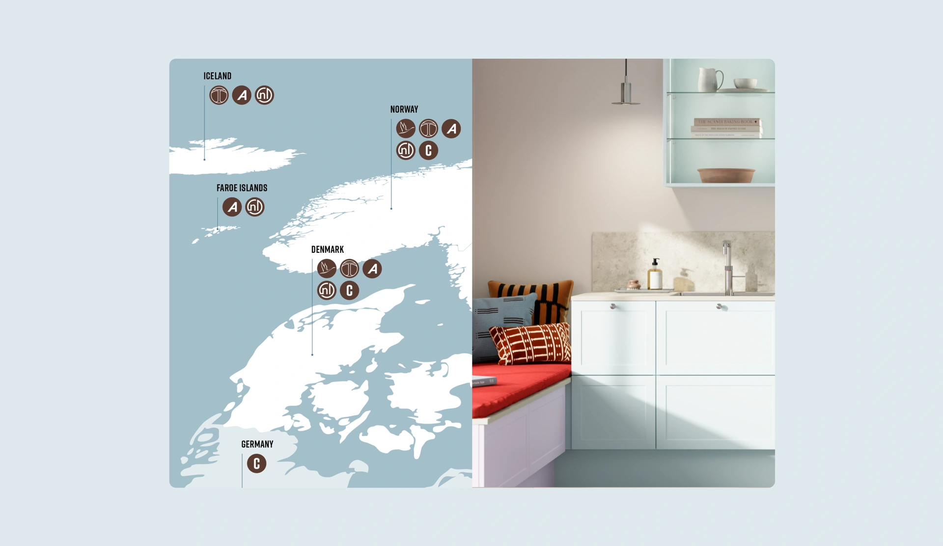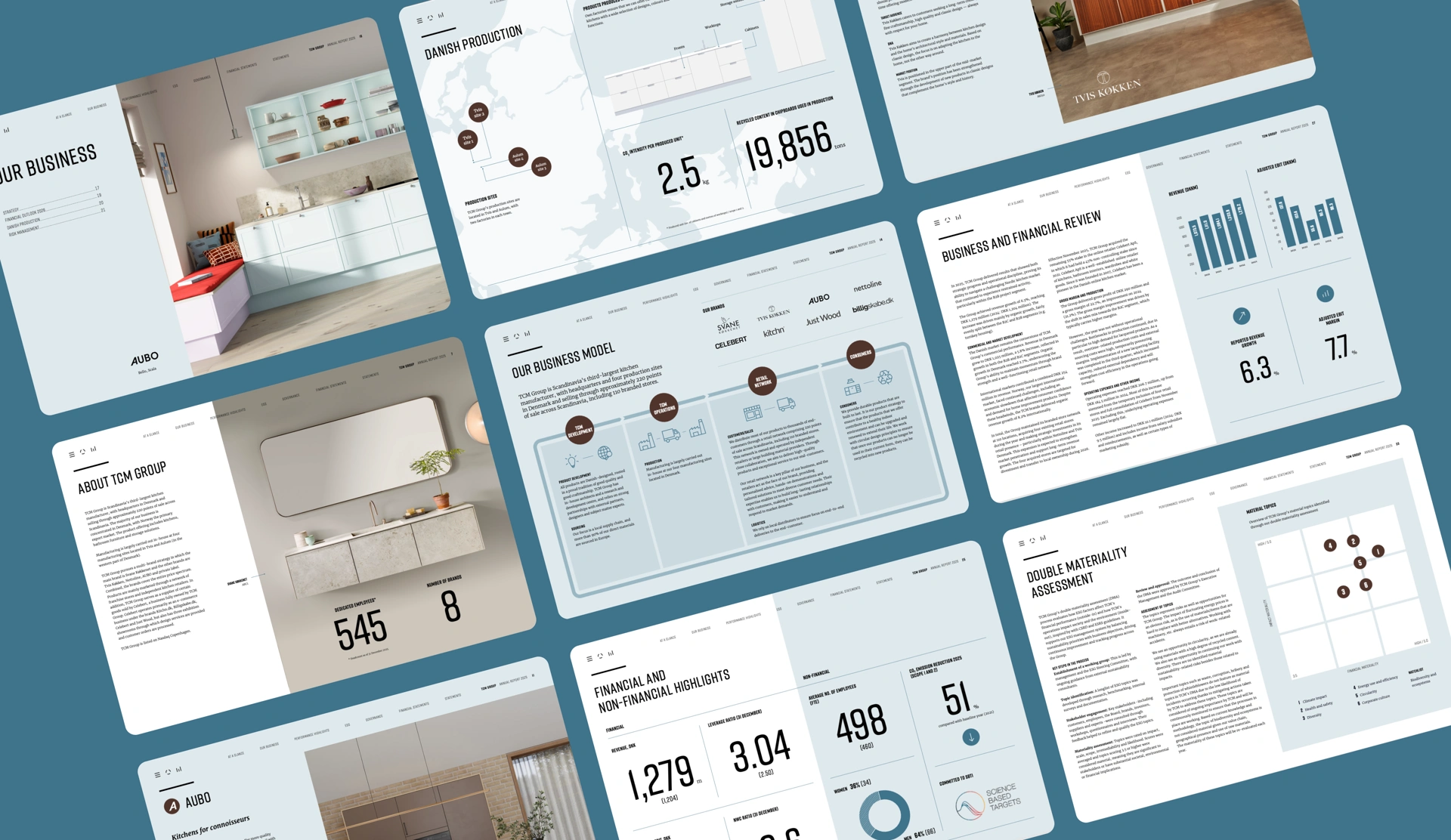 In the same spirit, we help shape, design, and report on the Group’s annual activities, financial performance, and sustainability efforts. Their reporting universe is built on a simple palette of light blue and white, complemented by a warm brown contrast — a subtle nod to the craftsmanship that defines their kitchens.